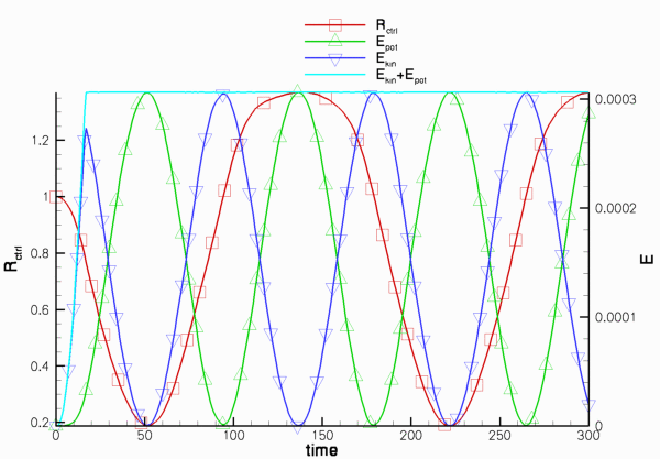 We compute the total kinetic and potential (=strain) energies stored in the (quarter-)ring and document them, their sum, and the control radius in the trace file.