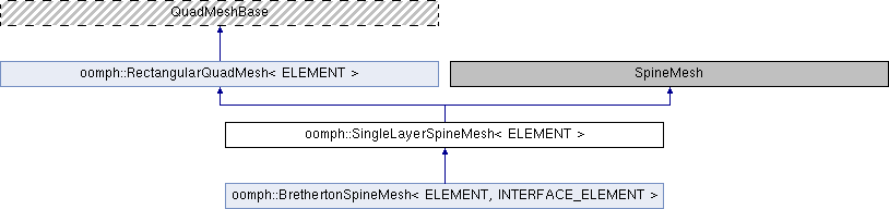 Single-layer spine mesh class derived from standard 2D mesh. The mesh contains a layer of spinified fluid elements (of type ELEMENT; e.g SpineElement<QCrouzeixRaviartElement<2>). It constructs the spines and contains the information on how to update the nodal positions within the mesh as a function of the spine lengths. Equations that determine the spine heights (even if they are pinned) must be specified externally or else there will be problems.