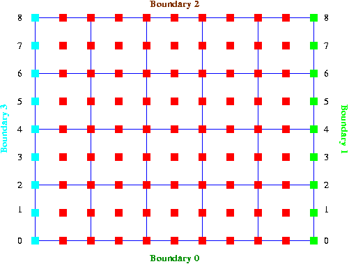 Here is a sketch of a 2D rectangular quad mesh. If this mesh is to be used in a problem with periodic boundary conditions in the horizontal direction (as in the above example), the pointer to node 3 on boundary 3 would have to be used when node 3 on boundary 1 is made periodic, etc. The appropriate commands are