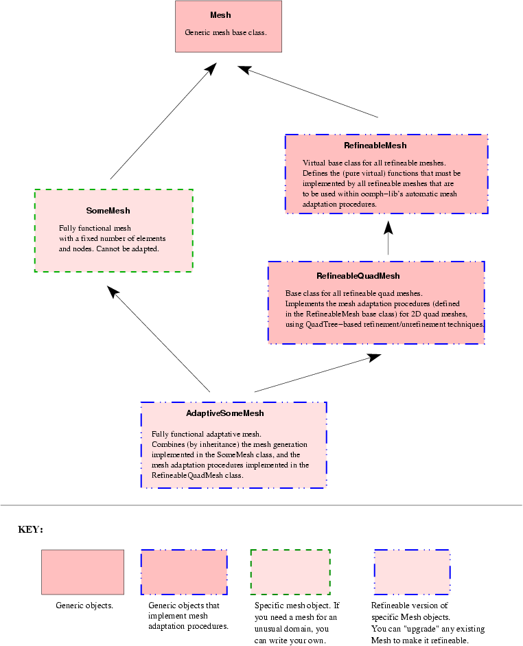 SomeMesh is some basic, non-refineable mesh that is derived directly from the generic Mesh base class. Typically, it provides a coarse discretisation of a 2D domain with 2D elements from the QElement family. Its constructor creates the mesh's nodes and elements and initialises the various boundary lookup schemes. (Consult the "How to build a mesh" section of the Quick Guide for details of the generic mesh generation process.)RefineableSomeMesh is the refineable equivalent of the basic SomeMesh. It inherits the original mesh layout from the SomeMesh class. Refineability is added by inheriting from the RefineableQuadMesh class; this class implements the mesh adaptation procedures, specified as pure virtual functions in the RefineableMesh class, for 2D quad meshes, employing QuadTree - based refinement techniques.Equivalent inheritance structures can be/are implemented for meshes with different element topologies: For instance, the RefineableBrickMesh class is the 3D equivalent of the RefineableQuadMesh class: It performs the mesh adaptation for 3D brick meshes by OcTree - based refinement techniques.